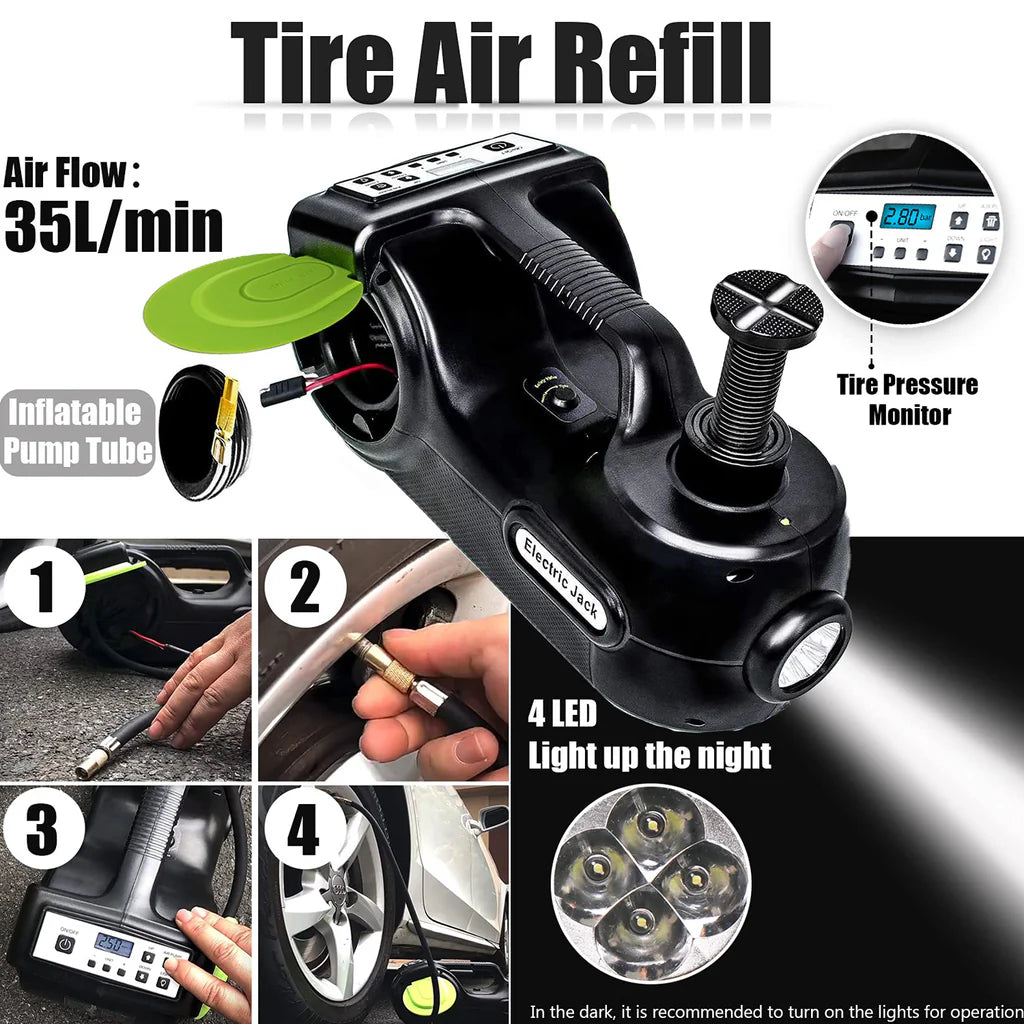 The NW-12V 5TON Electric Car Hydraulic Digital Jack offers a powerful 5-ton lifting capacity (6.1”-17.7” range), it can lift vehicles within 5 tons in less than 2 mins to its Max height 45cm. hydraulic jack nearly matches all the autos, sedan, SUV, MPV, pickup and truck. perfect for roadside emergencies and garage repairs. It includes an air pump, LED light, electric impact wrench, battery clamp cable, power cable, safety tools, and a plastic tool box for convenience.